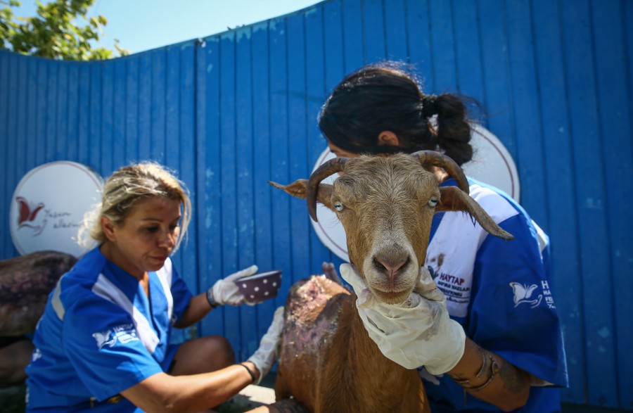 İlk tedavileri de burada yapılan ve vücutlarının çeşitli yerlerinde yanıklar bulunan küçükbaş hayvanlara Emekli Hayvanlar Çiftliği'nde özenle bakılıyor.