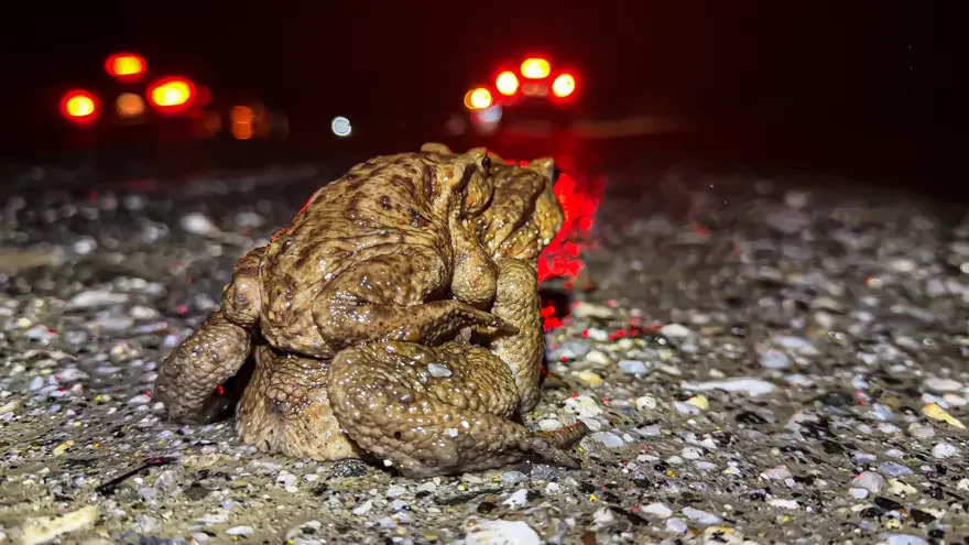 Aynı anlarda yola çıkan yüzlerce kurbağa kimi zaman birbirlerinin sırtında ilerliyor. Bazıları ise yoğun araç trafiği nedeniyle ezilerek can veriyor.