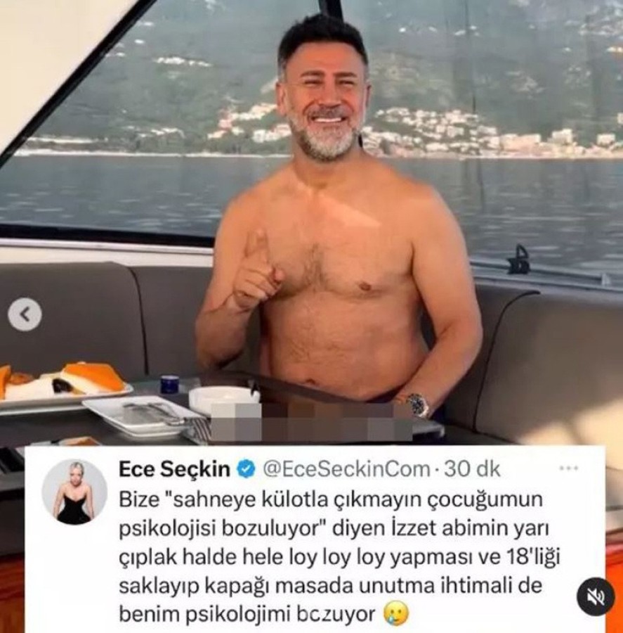 Şarkıcı Ece Seçkin "Bize 'sahneye külotla çıkmayın çocuğumun psikolojisi bozuluyor' diyen İzzet Abime bakın!" diyerek şunları söyledi: