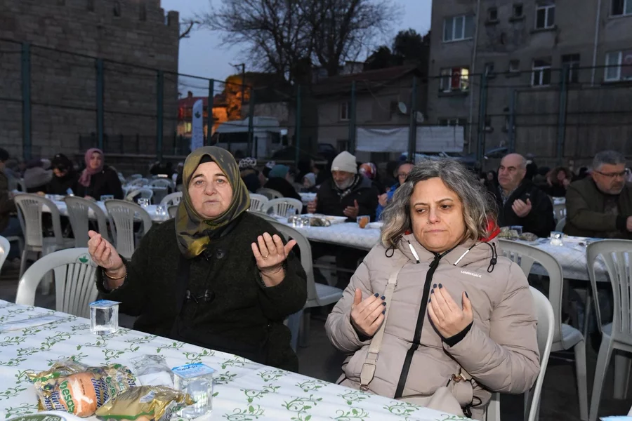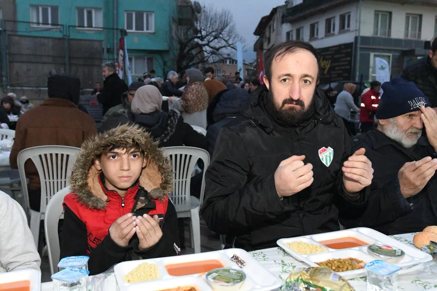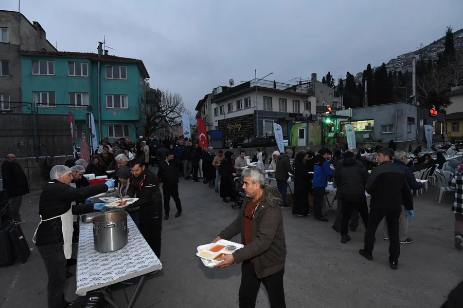 Osmangazi Belediyesi tarafından Alacahırka Pazar Alanı'nda düzenlenen iftar programında vatandaşlar, Ramazan'ın bereketini ve paylaşma kültürünü aynı sofrada buluşarak hissetti. İftar saatinin yaklaşmasıyla birlikte pazar alanını dolduran mahalle sakinleri kurulan uzun sofralarda yerlerini alırken, programa katılan Osmangazi Belediye Başkanı Erkan Aydın'a belediye başkan yardımcıları ve meclis üyeleri eşlik etti.