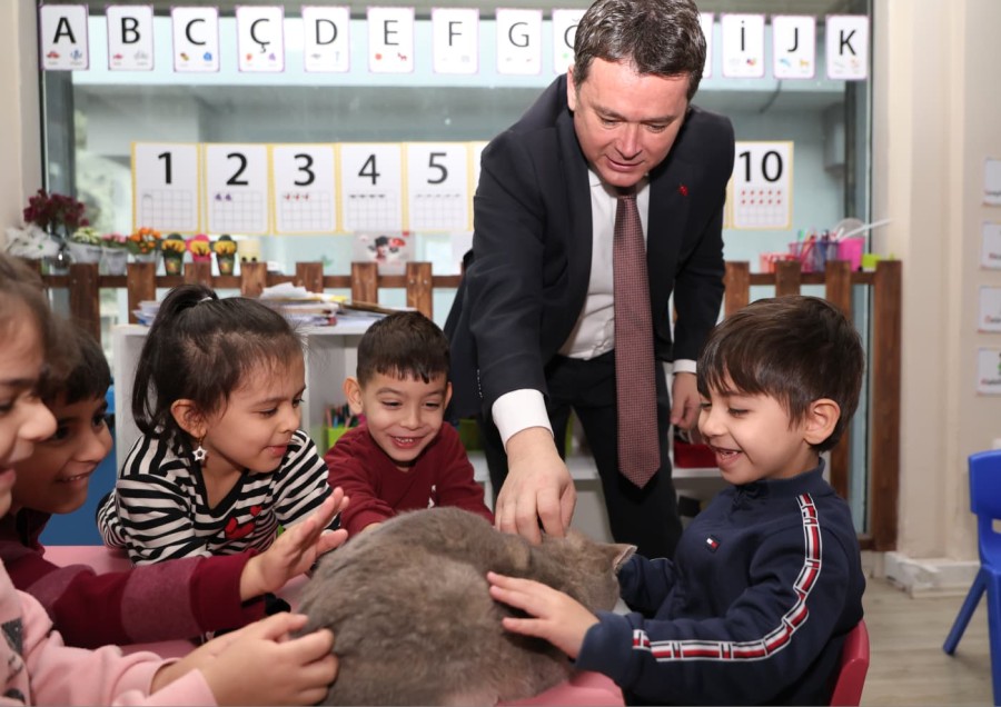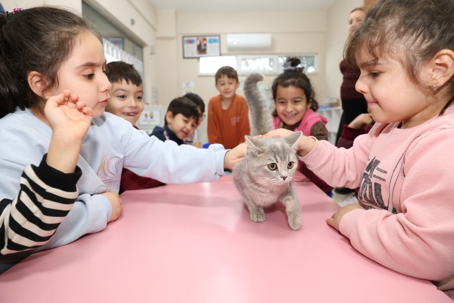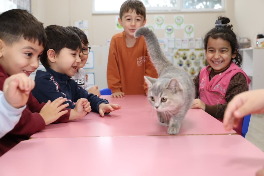 Tanıtım günlerinde hayvan sevgisini artırmak amacıyla kreşe getirilen sevimli kedi ise miniklere keyifli anlar yaşattı.