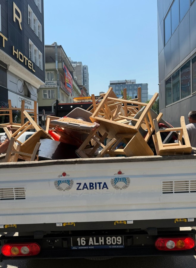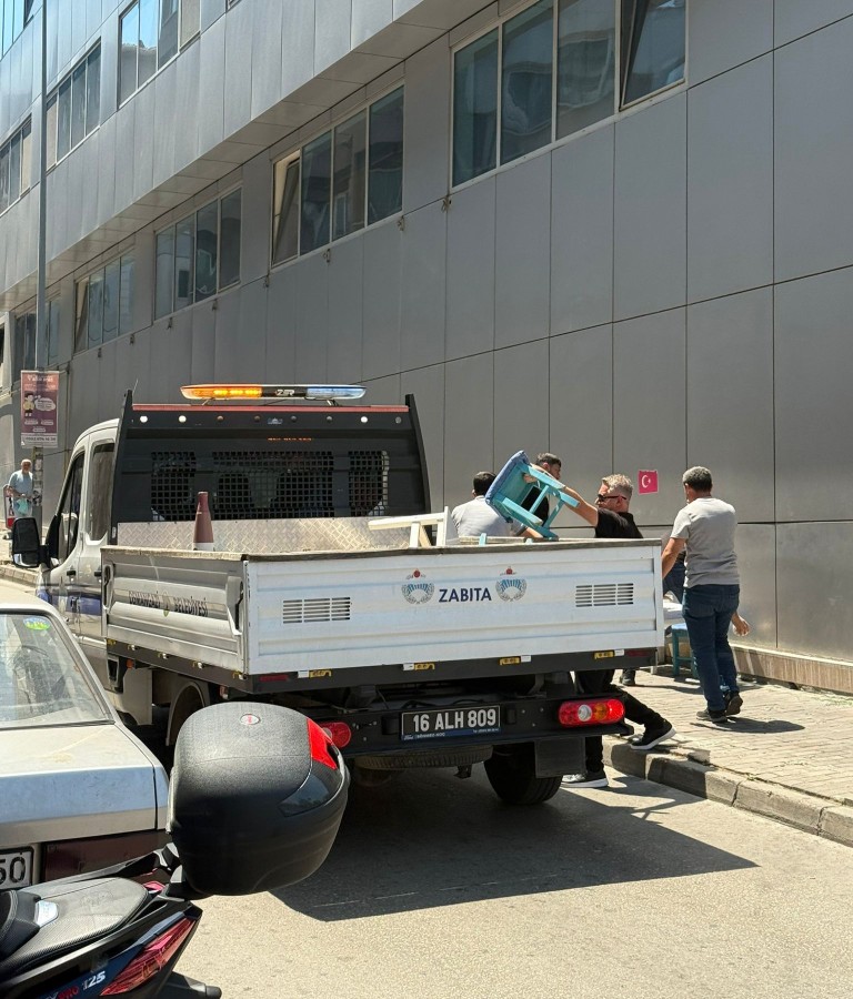 Osmangazi Belediyesi Zabıta Müdürlüğü ekipleri, Kırcaali Mahallesi'nde yaptığı denetimle kaldırımları işgal eden işyerlerinin masa ve sandalyelerini topladı.