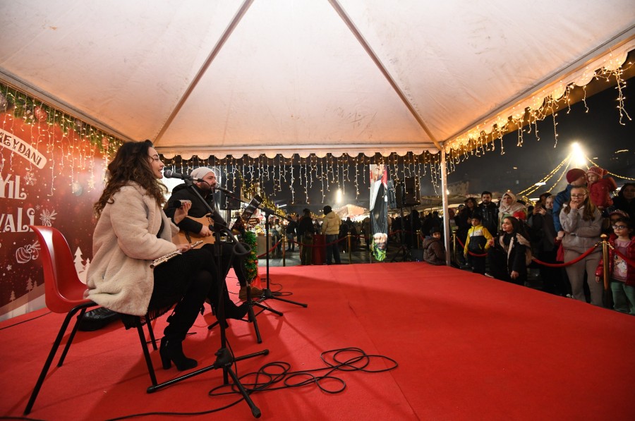 Sevilen şarkıları kendilerine özgü yorumlarıyla seslendiren ikili, soğuk havaya rağmen meydanı dolduran kalabalığın içini ısıttı.
