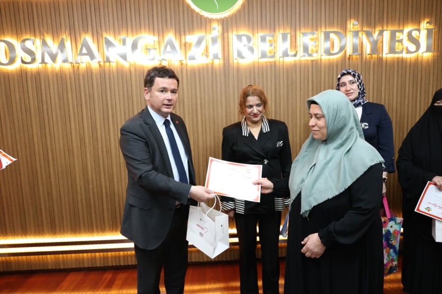 Osmangazi Belediyesi Meslek Edindirme Kursları (OSMEK) bünyesindeki okuma yazma kursuna katılan 26 kursiyer, mezuniyet heyecanı yaşadı. Sertifikalarını Başkan Erkan Aydın'ın elinden alan kadınların heyecanı ve mutluluğu ise görülmeye değerdi.