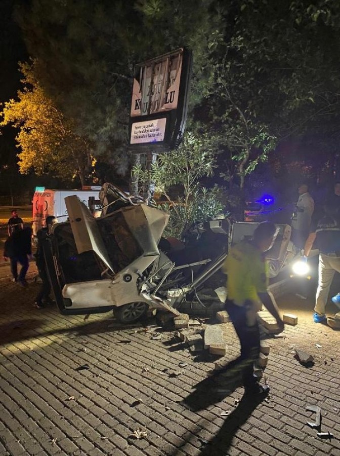Aydın'ın Efeler ilçesinde kaldırımdaki bilgilendirme tabelasının direğine çarpan otomobildeki 2 kişi, hayatını kaybetti.