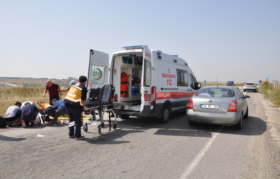 Tekirdağ'da otomobilin motosiklete çarptığı kazada motosiklette bulunan iki kişi ağır yaralandı.