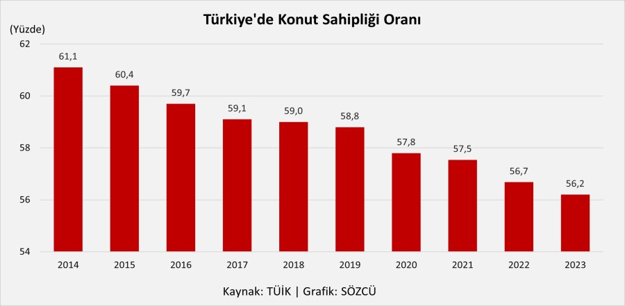 Türkiye'de konut krizi derinleşirken oturulan eve sahip olanların oranı da yıldan yıla azalmaya devam ediyor.