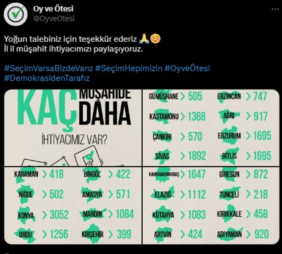 2014 yılından bu yana 8 seçimde görev yapan Oy ve Ötesi Derneği, Twitter üzerinden yaptığı paylaşım ile il il ihtiyaç duyulan müşahit sayısını açıkladı.