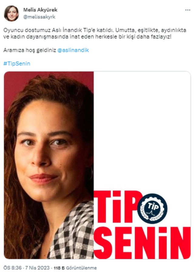 Türkiye İşçi Partisi(TİP) İstanbul İl Sözcüsü Melis Akyürek, oyuncu Aslı İnandık'ın TİP'e katıldığını duyurdu.