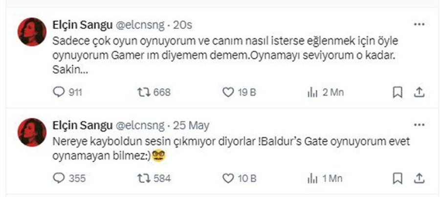 Bilgisayar oyunu oynadığı açıklayan Sangu, 516.7 bin takipçisi bulunan X (Twitter) hesabından "'Nereye kayboldun, sesin çıkmıyor' diyorlar! 'Baldur's Gate' oynuyorum. Evet, oynamayan bilmez" mesajını yazdı.