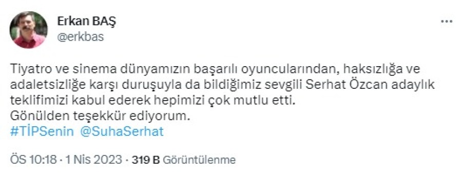 Türkiye İşçi Partisi Genel Başkanı Erkan Baş, oyuncu Serhat Özcan'ın Türkiye İşçi Partisi'nden(TİP) milletvekili adayı olacağını açıkladı.