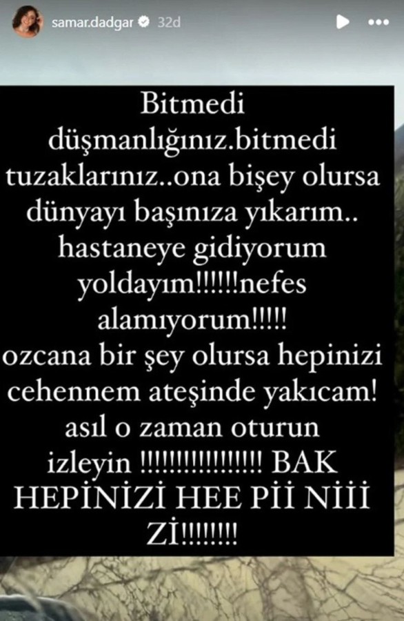 "Bitmedi düşmanlığınız, bitmedi tuzaklarınız. Ona bir şey olursa dünyayı başınıza yıkarım. Hastaneye gidiyorum yoldayım! Nefes alamıyorum! Özcan'a bir şey olursa hepinizi cehennem ateşinde yakacağım. Asıl o zaman oturun izleyin. Hepinizi... Hepinizi..."