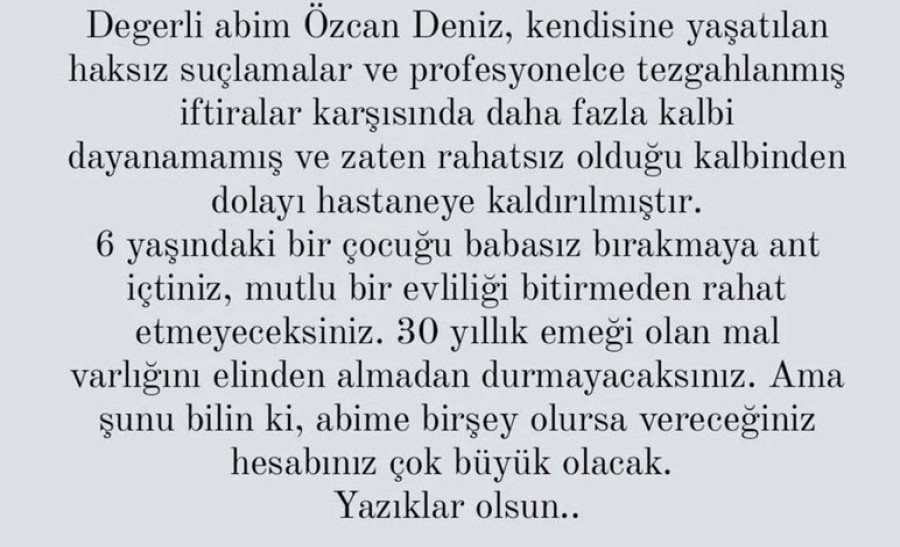 "Değerli ağabeyim Özcan Deniz, kendisine yaşatılan haksız suçlamalar ve profesyonelce tezgâhlanmış iftiralar karşısında daha fazla kalbi dayanamamış ve zaten rahatsız olduğu kalbinden dolayı hastaneye kaldırılmıştır. 6 yaşındaki bir çocuğu babasız bırakmaya ant içtiniz, mutlu bir evliliği bitirmeden rahat etmeyeceksiniz. 30 yıllık emeği olan mal varlığını elinden almadan durmayacaksınız. Ama şunu bilin ki, ağabeyime bir şey olursa vereceğiniz hesabınız çok büyük olacak. Yazıklar olsun..."