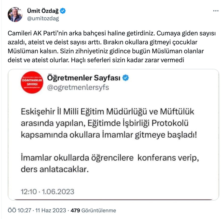 "Camileri AK Parti'nin arka bahçesi haline getirdiniz. Cumaya giden sayısı azaldı, ateist ve deist sayısı arttı" iddiasında bulunan Ümit Özdağ, "Bırakın okullara gitmeyi çocuklar Müslüman kalsın. Sizin zihniyetiniz gidince bugün Müslüman olanlar deist ve ateist olurlar. Haçlı seferleri sizin kadar zarar vermedi" diye yazdı.