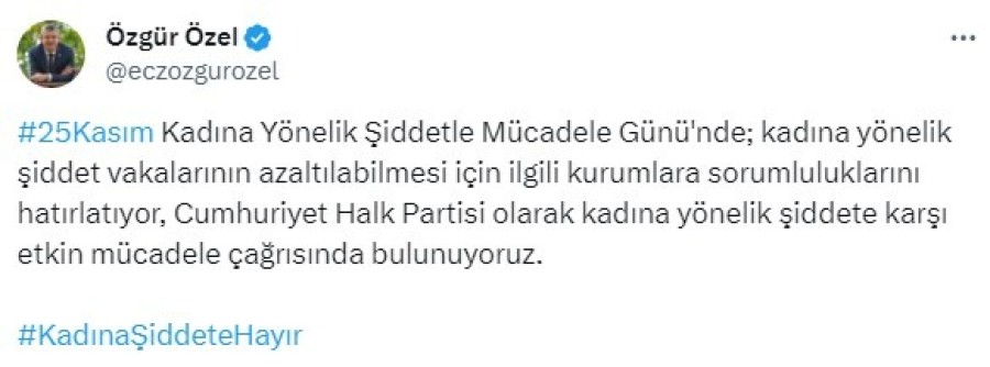 Cumhuriyet Halk Partisi (CHP) Genel Başkanı Özgür Özel, 25 Kasım Kadına Karşı Şiddetle Mücadele Günü dolayısıyla bir mesaj paylaştı.