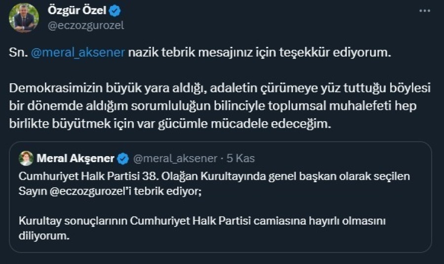 CHP Genel Başkanı Özgür Özel, genel başkan seçilmesinin ardından kendisin tebrik eden İYİ Parti Genel Başkanı Meral Akşener'e, "Tebrik mesajınız için teşekkür ediyorum. Demokrasimizin büyük yara aldığı, adaletin çürümeye yüz tuttuğu böylesi bir dönemde aldığım sorumluluğun bilinciyle toplumsal muhalefeti hep birlikte büyütmek için var gücümle mücadele edeceğim" diyerek yanıtladı.