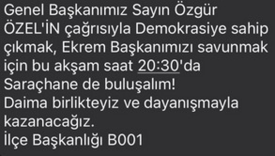 "Genel Başkanımız Sayın Özgür Özel'in çağrısıyla Demokrasiye sahip çıkmak, Ekrem Başkanımızı savunmak için bu akşam saat 20:30'da Saraçhane de buluşalım! Daima birlikteyiz ve dayanışmayla kazanacağız"