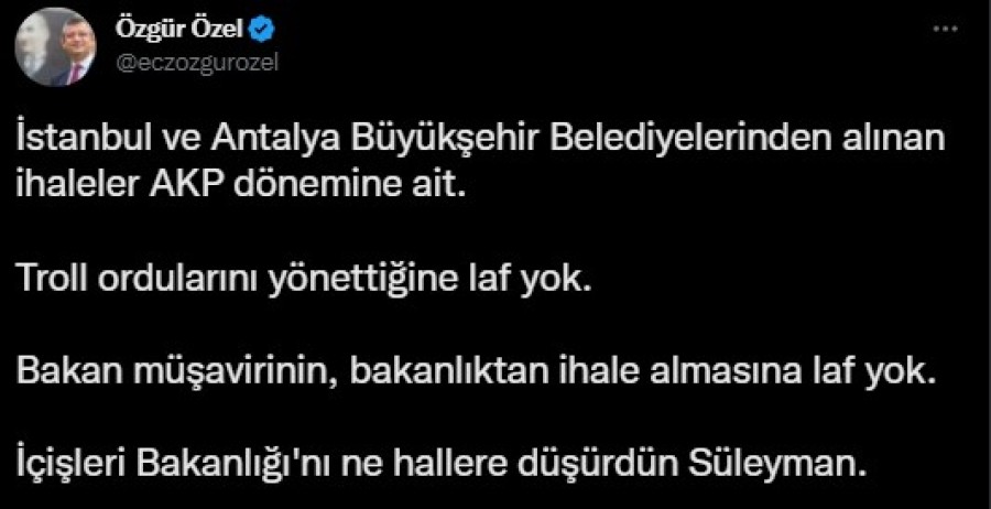 CHP'li Özel, "Süleyman Soylu'nun 8 bin kişilik troll ordusunu yöneten kişi" iddiasıyla ismini açıkladığı Emin Şen ile ilgili İçişleri Bakanlığı ve Şen tarafından yapılan açıklamalara yanıt verdi.