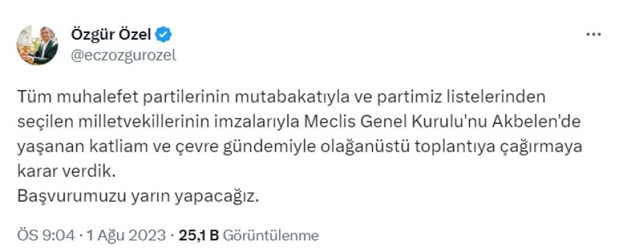 "Tüm muhalefet partilerinin mutabakatıyla ve partimiz listelerinden seçilen milletvekillerinin imzalarıyla Meclis Genel Kurulu'nu Akbelen'de yaşanan katliam ve çevre gündemiyle olağanüstü toplantıya çağırmaya karar verdik. Başvurumuzu yarın yapacağız."