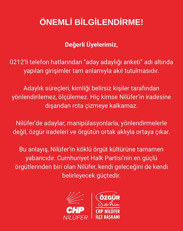 "CHP Nilüfer İlçe Başkanlığımız tarafından, +90 (212) 945 19 66 numaralı hattan yapılan ve üyelerimizi hedef alan "ilçe başkan aday adaylığı anketi" ile ilgili suç duyurusunda bulunulmuştur. Konuyla ilgili tüm yasal süreç başlatılmış olup, sürecin sonuna kadar takipçisi olacağız.