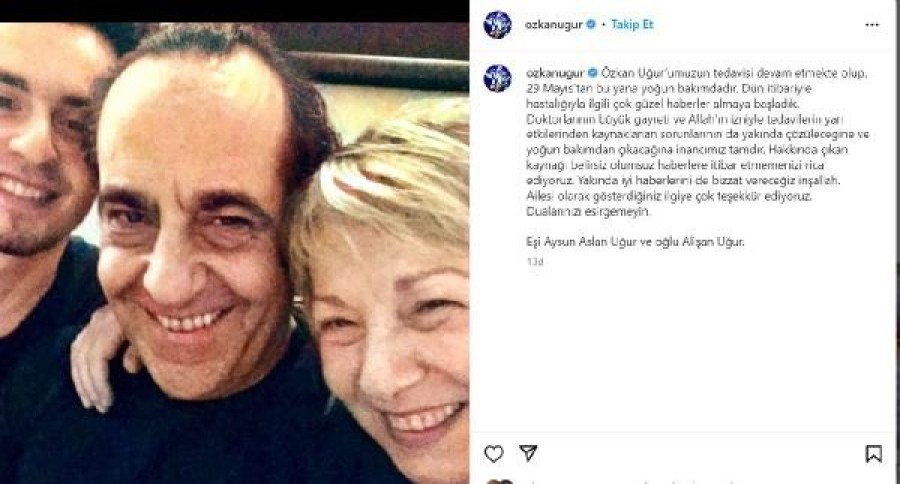 Usta sanatçı Özkan Uğur'un eşi Aysun Uğur ve oğlu Alişan Uğur, Instagramdan yaptıkları açıklama ile Özkan Uğur'un sağlık durumu hakkında bilgi verdi.