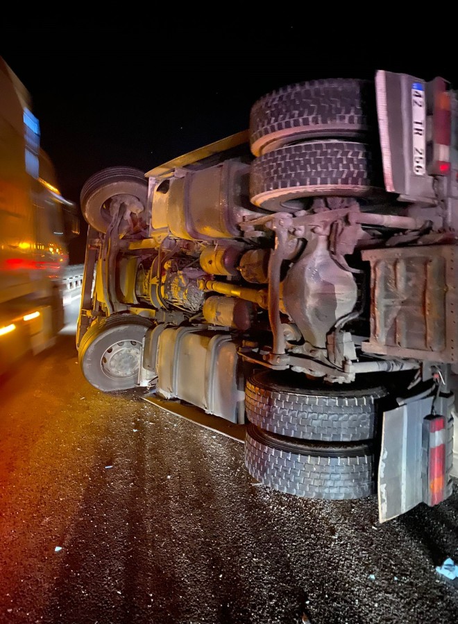 Bilecik'te seyir halinde devrilen paket tavuk yüklü tırın sürücüsü yaralanırken, kapanana yolda uzun araç kuyrukları oluştu.