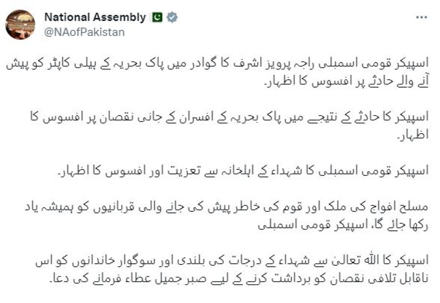 Pakistan Ulusal Meclisi Sözcüsü Ashraf, Pakistan Donanması'na bağlı helikopterde hayatını kaybeden 3 askerin ailelerine baş sağlığı dileyerek, derin üzüntü duyduğunu belirtti.