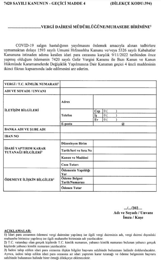 Hazine ve Maliye Bakanlığı Gelir İdaresi Başkanlığı tarafından yayımlanan tebliğ ile koronavirüs salgının ilk kez görüldüğü 11 Mart 2020 tarihinden 9 Kasım 2022 tarihine kadar geçen dönemde, tahsil edilen cezalardan vazgeçildiği bildirildi.