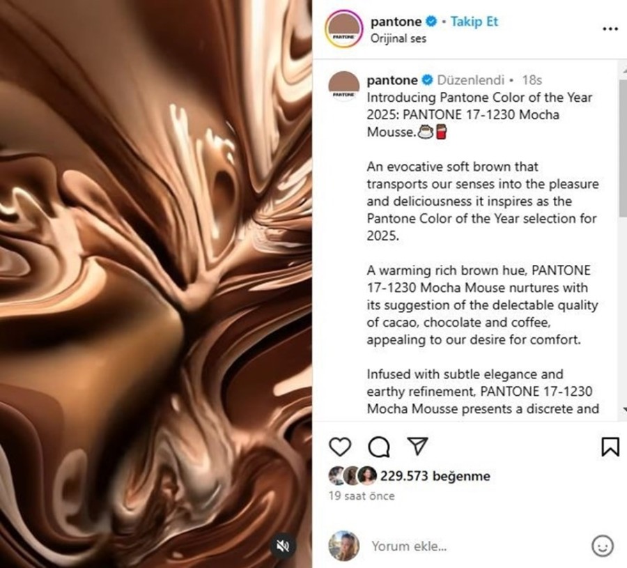 Her yıl tasarım dünyasına yön veren Pantone Color Institute, 2025'in rengini PANTONE 17-1230 Mocha Mousse olarak açıkladı.2025 yılı itibarıyla, bu rengin moda, iç mekan tasarımı, grafik sanatları ve günlük yaşamın pek çok alanında geniş bir etki yaratması bekleniyor.