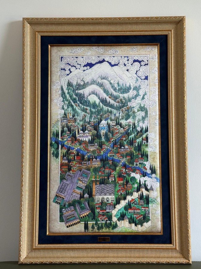 Vatikan Devlet Başkanı'na, Osmanlı'nın ilk başkenti Bursa'yı Uludağ'dan aşağıya doğru bir "cennet tasviri" üslubuyla gösteren, Bursa ipeğinden yapılmış Nusret Çolpan çizimi bir minyatür de takdim edildi.