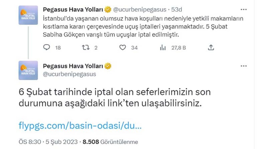 Pegasus, hava muhalefeti nedeniyle yolcularına uçuş iptalleriyle ilgili sosyal medya hesaplarından duyuru mesajı yayınladı.