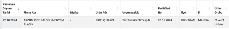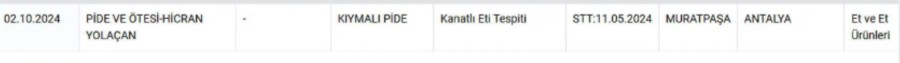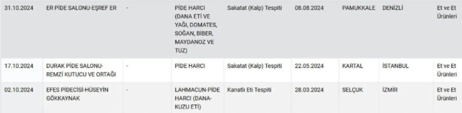 Bakanlık tarafından yayımlanan listelerde yer alan bazı pidecilerin ürünlerinde "Tek Tırnaklı Eti", "Kanatlı Eti" ve "Sakatat" tespit edildi.