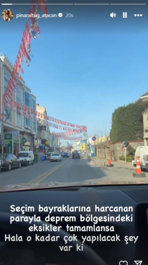 Aracından bir paylaşım yapan Pınar Altuğ "Şu seçim bayraklarına vs harcanacak masraf bütün partiler için söylüyorum, şunlara harcanan parayla deprem bölgelerine neler neler yapılırdı. Çok üzgünüm yani gerçekten üzgünüm hale bak. Buna harcanan ödenek, deprem bölgesine gitse, ihtiyacı olanlara gitse ne güzel olur di mi?" dedi.
