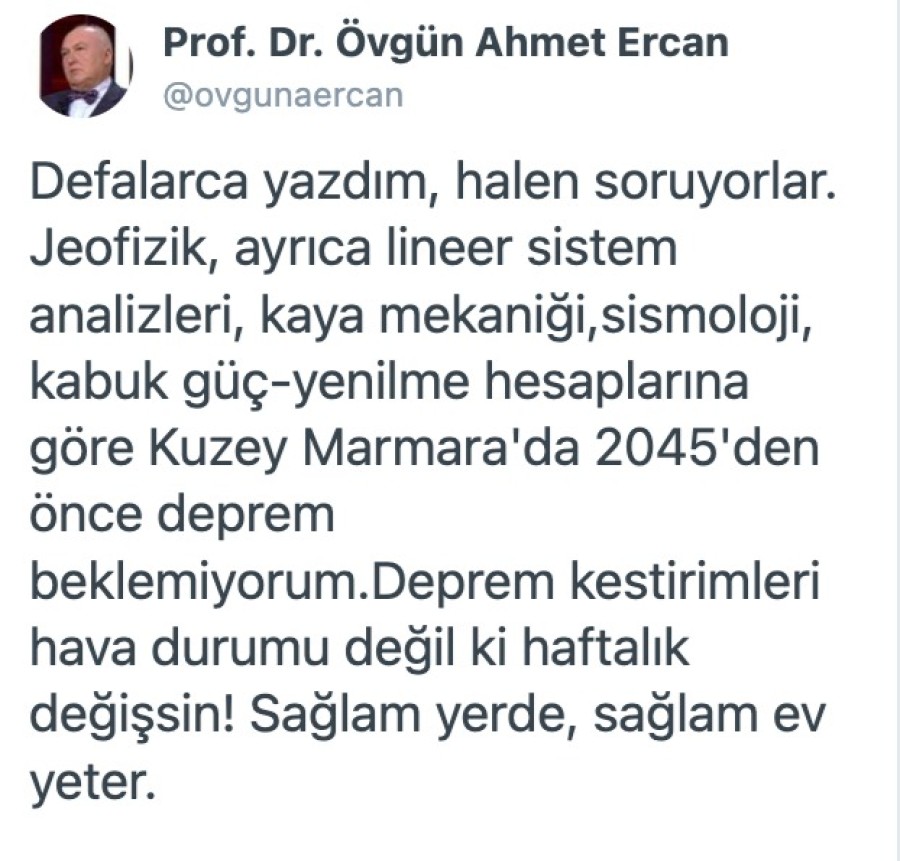 Ercan, "Defalarca yazdım, halen soruyorlar. Jeofizik, ayrıca lineer sistem analizleri, kaya mekaniği, sismoloji, kabuk güç-yenilme hesaplarına göre Kuzey Marmara'da 2045'den önce deprem beklemiyorum. Deprem kestirimleri hava durumu değil ki haftalık değişsin! Sağlam yerde, sağlam ev yeter" ifadelerini kullandı.