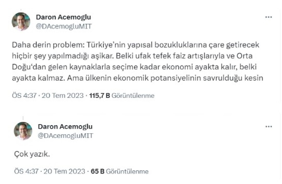 Yurtdışından edinilen finansman ile enflasyonunun dizginlemeyeceğini vurgulayan Daron Acemoğlu paylaşımında şu ifadelere yer verdi: