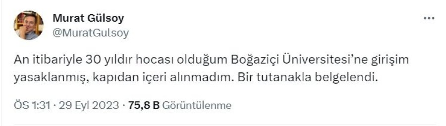 Sosyal medya hesabından açıklama yapan Gülsoy, "An itibariyle 30 yıldır hocası olduğum Boğaziçi Üniversitesi'ne girişim yasaklanmış, kapıdan içeri alınmadım. Bir tutanakla belgelendi" dedi.