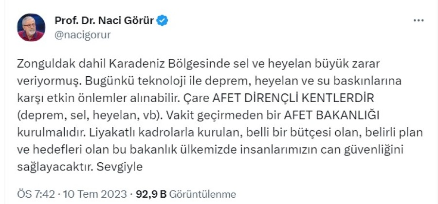 Prof. Görür, yaşananların ardından sosyal medya hesabından bir açıklama paylaştı. Görür, mevcut teknolojik imkanlarla bu tür afetlerin önüne geçilebileceğini ifade etti.