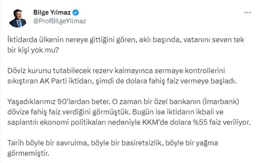 İYİ Parti Ekonomi Politikaları Başkanı ve Millet İttifakı Cumhurbaşkanı adayı Kemal Kılıçdaroğlu'nun pazar günkü seçimleri kazanması durumunda Hazine Bakan adayı Prof. Dr. Bilge Bilge Yılmaz, sosyal medya hesabından katıldığı bir yayından kesit paylaştı. Paylaşımında "İktidarda ülkenin nereye gittiğini gören, aklı başında, vatanını seven tek bir kişi yok mu?" diye soran Yılmaz, AKP iktidarının dolara "fahiş" faizler verdiğini belirtti.