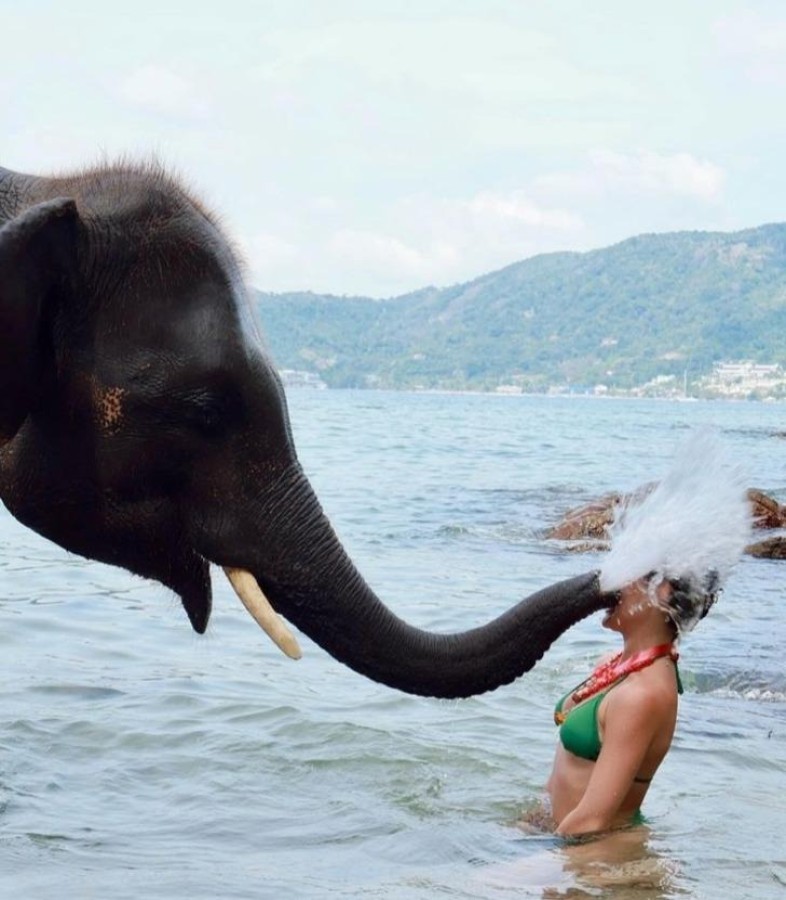 Rabia Soytürk, fil ile mükemmel bir uyum yakalayarak poz üstüne poz verdi. Rabia Öztürk filin burnuna oturdu, sırtına yaslandı, öptü kokladı...