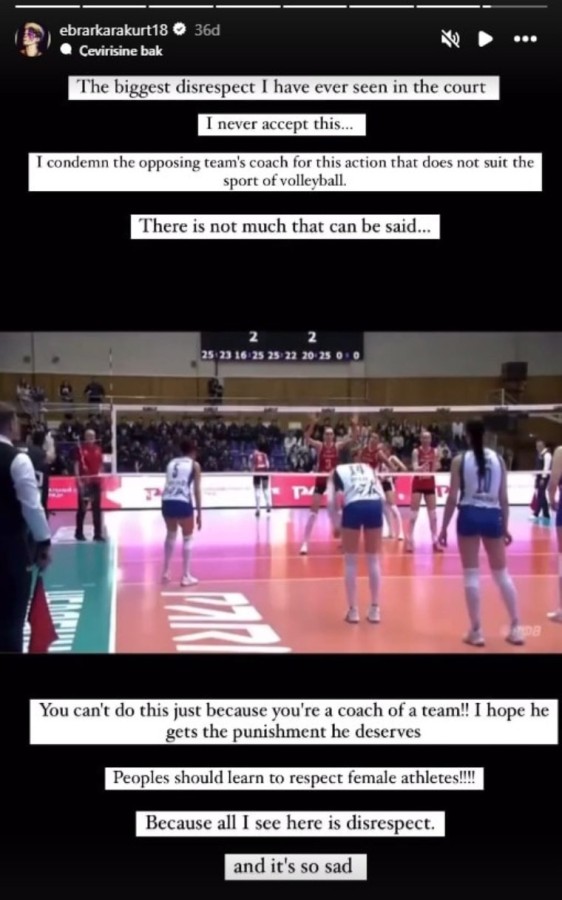 "Sahada gördüğüm en büyük saygısızlık. Bunu asla kabul etmiyorum... Voleybol sporuna yakışmayan bu hareketten dolayı karşı takım hocasını kınıyorum.