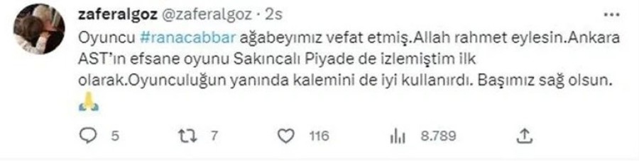 Oyuncu Zafer Algöz, Cabbar'ın vefatına ilişkin Twitter hesabında yaptığı paylaşımında, "Oyuncu Rana Cabbar ağabeyimiz vefat etmiş. Allah rahmet eylesin. Oyunculuğun yanında kalemini de iyi kullanırdı. Başımız sağ olsun" ifadelerine yer verdi.