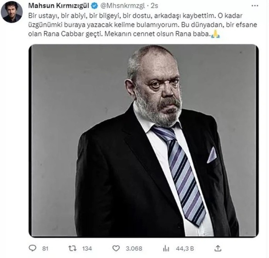 Oyuncu, yönetmen ve şarkıcı Mahsun Kırmızıgül ise Twitter'da, "Bir ustayı, bir abiyi, bir bilgeyi, bir dostu, arkadaşı kaybettim. O kadar üzgünüm ki buraya yazacak kelime bulamıyorum. Bu dünyadan bir efsane olan Rana Cabbar geçti. Mekanın cennet olsun Rana baba" ifadelerini kullandı.