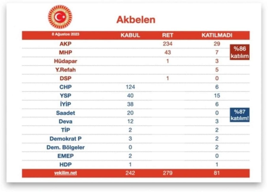 CHP'nin TBMM'de Akbelen için genel görüşme açılması talebine yönelik önerge önceki gün 37 oy farkla reddedildi. Hukuksuzca cezaevinde tutulduğu için görüşmelere katılamayan TİP Hatay Milletvekili Can Atalay'a ek olarak; görüşmelere 36 muhalefet milletvekilinin daha katılmadığı ortaya çıktı.
