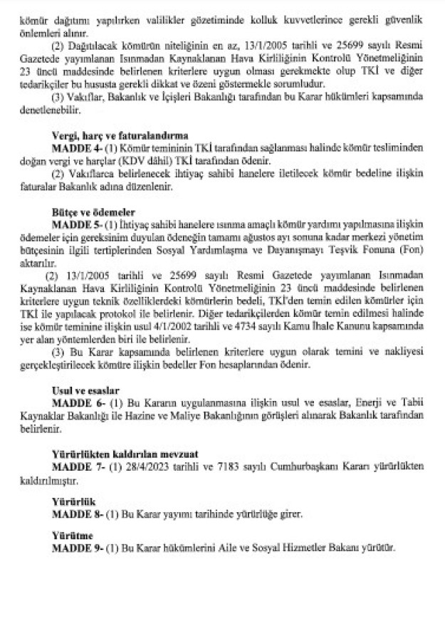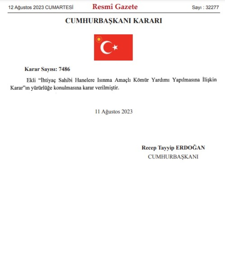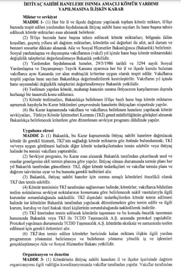 Resmi Gazete'de yayımlanan Cumhurbaşkanı kararına göre, İhtiyaç sahibi hanelere ısınma amaçlı kömür yardımı yapılacağı duyuruldu.