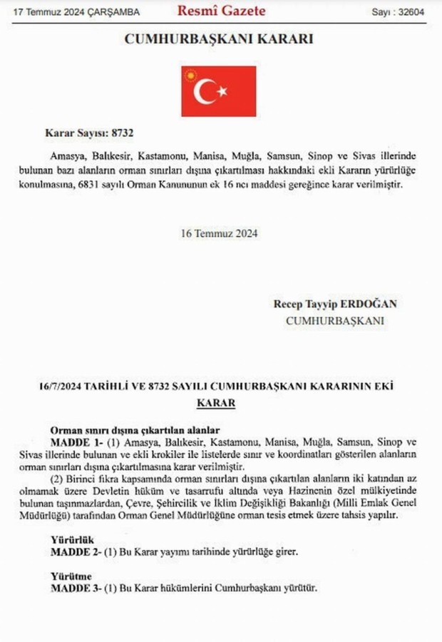 Cumhurbaşkanı Recep Tayyip Erdoğan'ın imzasıyla Amasya, Balıkesir, Kastamonu, Manisa, Muğla, Samsun, Sinop ve Sivas'taki bazı alanlar orman sınırları dışına çıkarıldı.