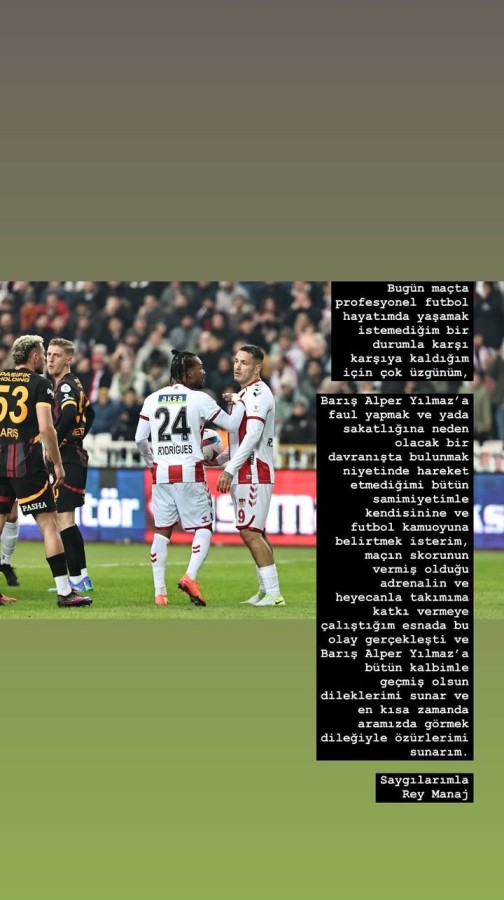 Rakibinin sakatlanmasına neden olan Sivassporlu Rey Manaj mücadelenin ardından sosyal medya hesabından bir paylaşımda bulunarak Barış Alper Yılmaz'dan özür diledi:
