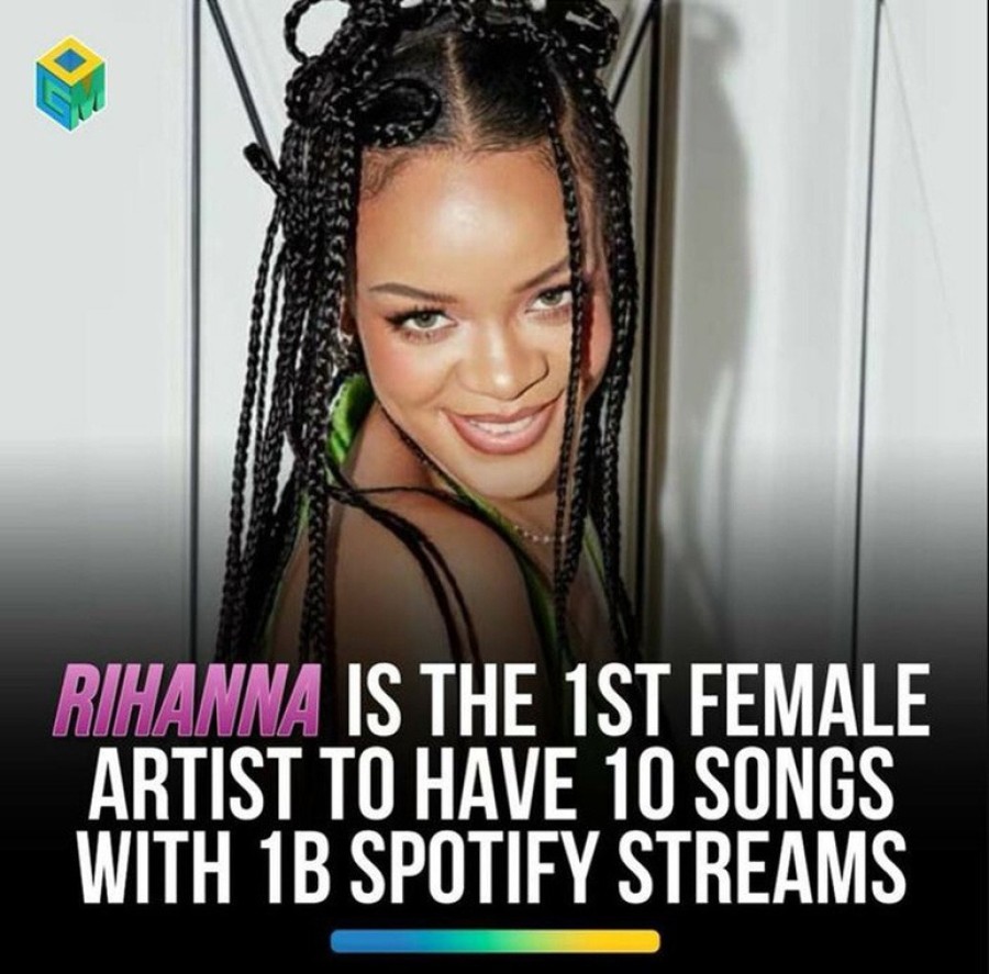 Rihanna, 7,5 yıldır yeni albüm çıkarmamasına rağmen, 10 şarkısı ile beraber bir milyar dinlenmeye ulaşan dünya üzerindeki ilk kadın müzisyen unvanını elde etti.
