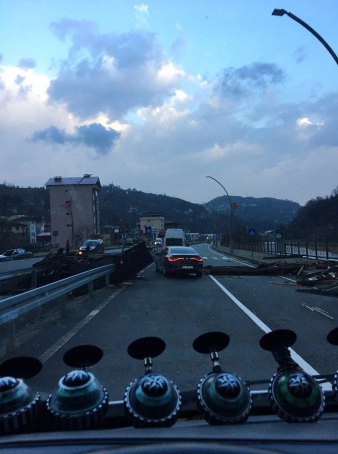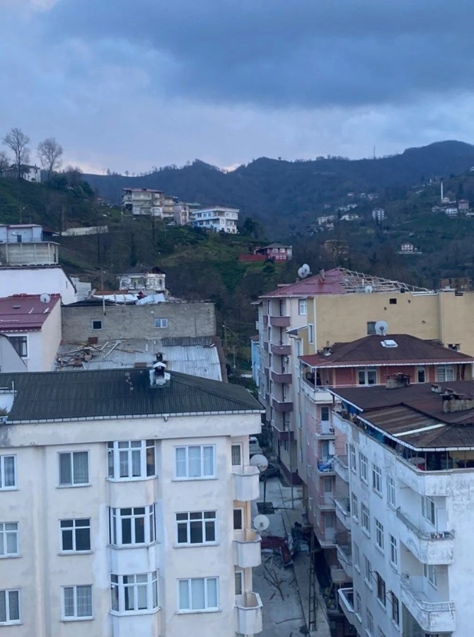 Binalardan uçuşan yapı malzemeleri ise çevreye saçıldı. Park halindeki araçların üzerine düşen çatı parçalarının yanı sıra sürüklenen dallar, Güneysu-Rize Otoyolu'nu kısmen trafiğe kapattı.