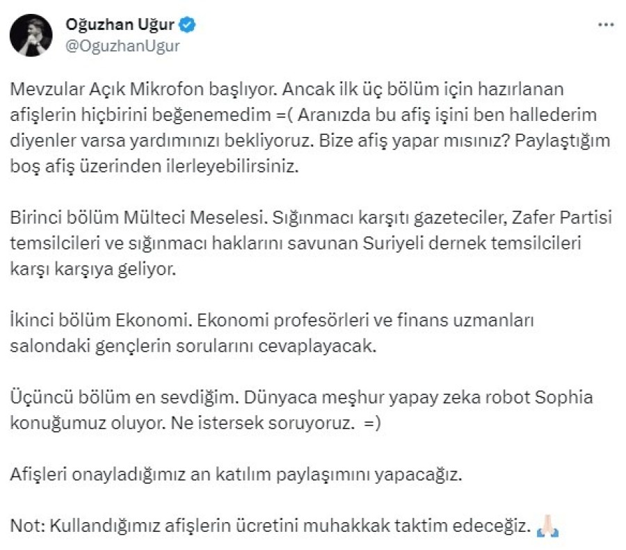 "Mevzular Açık Mikrofon başlıyor. Ancak ilk üç bölüm için hazırlanan afişlerin hiçbirini beğenemedim. Aranızda bu afiş işini ben hallederim diyenler varsa yardımınızı bekliyoruz. Bize afiş yapar mısınız? Paylaştığım boş afiş üzerinden ilerleyebilirsiniz.