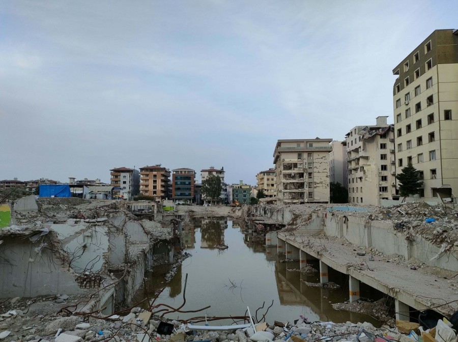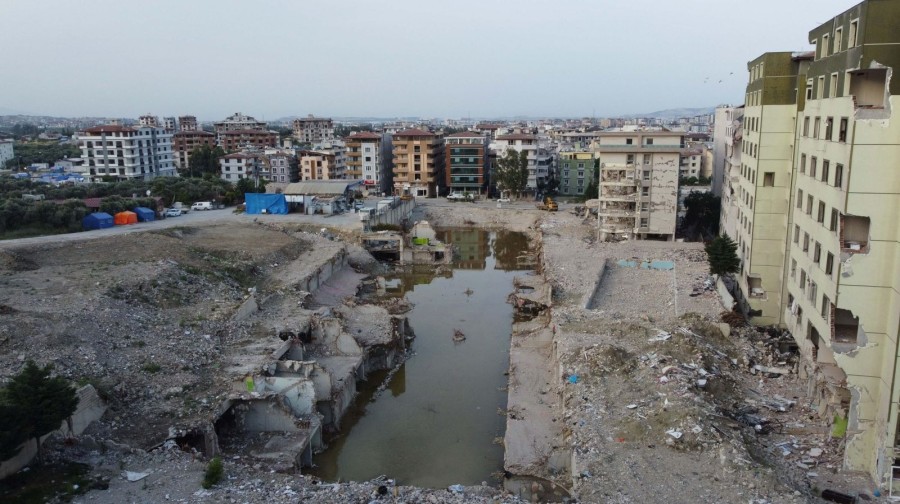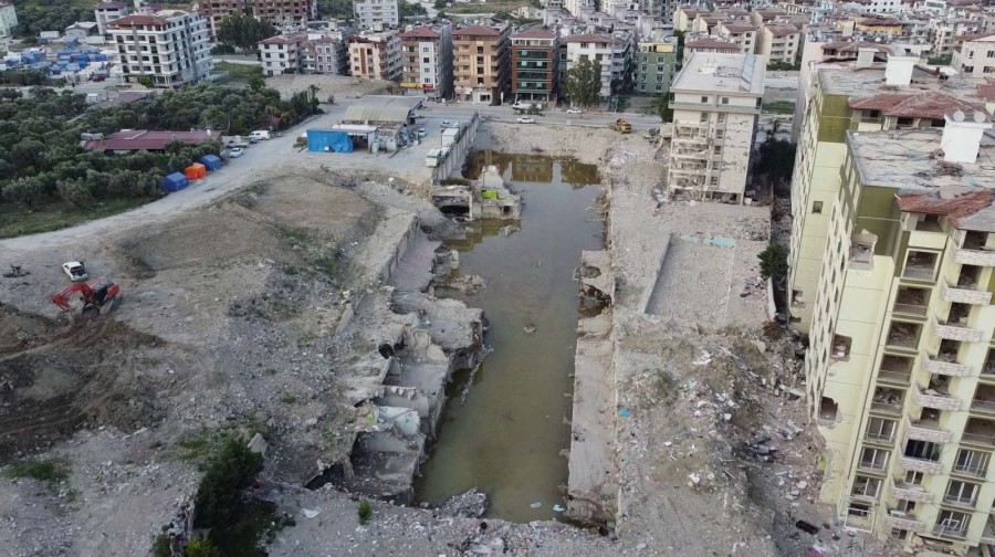Hatay'ın Antakya ilçesinde depremde yıkılan ve çok sayıda kişinin yaşamını yitirdiği 12 katlı Rönesans Rezidans'ın kaldırılan enkazının zemini suyla doldu.